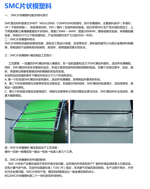 SMC复合材料是英文SHEET MOULDING COMPOUND的缩写,即片状模塑料。主要原材料由GF(专用纱)、UP(不饱和树脂)、低收缩添加剂,MD(填料)及各种助剂组成。